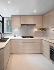 Tủ bếp Japandi kết hợp tinh thần Bắc Âu và Nhật Bản, chú trọng công năng và sự tinh tế. Bên cạnh đó, màu sắc thường là trắng, gỗ nhạt hoặc xanh pastel xu hướng mới. Do đó, bếp chữ U phong cách tối giản tạo cảm giác thư giãn và nhẹ nhàng. Đây là lựa chọn phù hợp gia đình yêu thích sự tinh gọn.