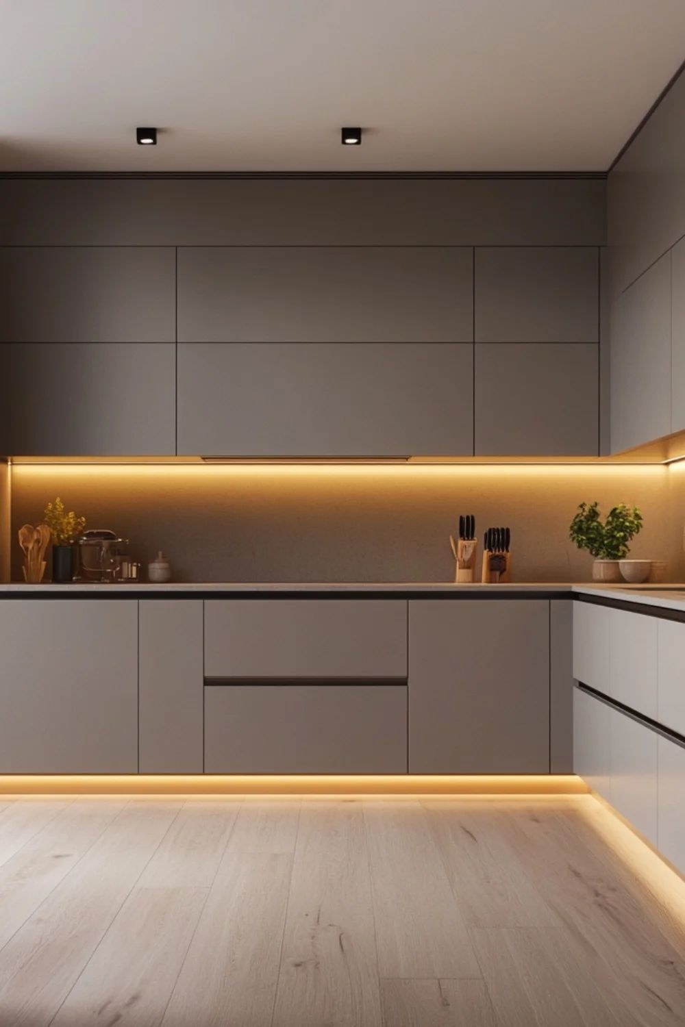 Nên chọn màu sáng như trắng, be hoặc xám nhạt để bếp trông rộng và thoáng hơn. Kết hợp phụ kiện thông minh như giá xoay, ray trượt giúp tận dụng tối đa không gian. Đặc biệt, tay nắm tối giản hoặc thiết kế âm tủ mang lại sự gọn gàng hiện đại. Những chi tiết nhỏ này nâng cao giá trị thẩm mỹ tổng thể.