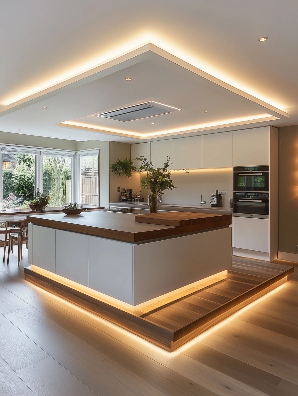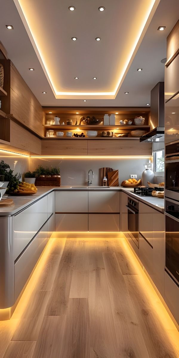 Trong thi công bếp, ánh sáng LED nên được lắp dưới kệ treo để chiếu sáng bàn bếp. Đèn LED viền tủ tạo hiệu ứng sang trọng, hiện đại và tiết kiệm điện. Ngăn kéo có thể tích hợp đèn cảm ứng giúp sử dụng dễ dàng hơn. Giải pháp này vừa tăng tính tiện dụng vừa nâng cao giá trị thẩm mỹ.