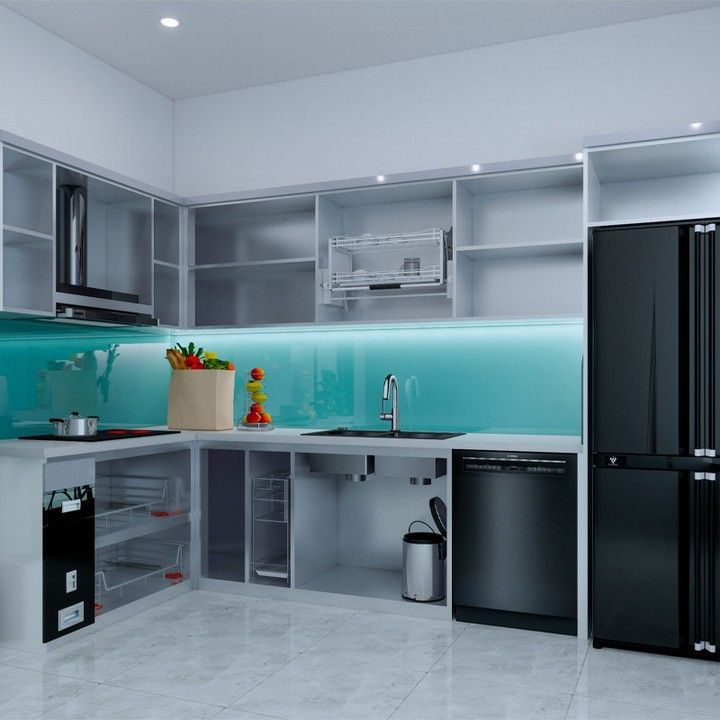 Tủ bếp chữ I đơn giản, dễ thi công bếp, phù hợp không gian hẹp nhưng vẫn đảm bảo tiện ích. Nội thất đẹp với kính ốp sáng màu giúp căn bếp nhỏ trông rộng rãi hơn.