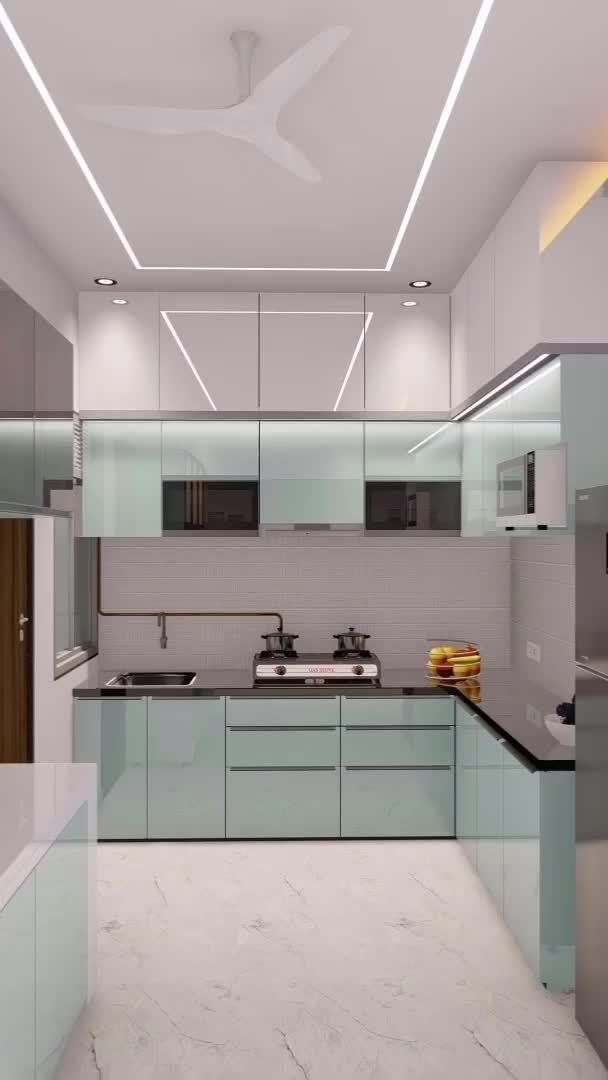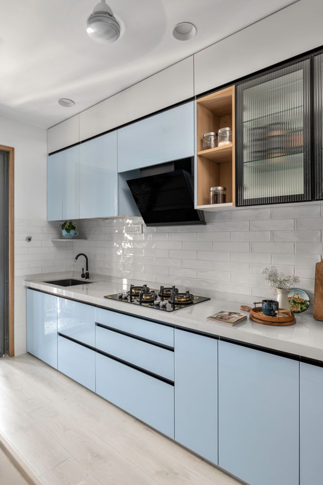 Kính ốp sáng màu kết hợp với gỗ công nghiệp giúp tăng độ sáng, tạo cảm giác không gian mở rộng. Nội thất đẹp với phụ kiện thông minh như giá xoay, ngăn kéo êm ái, mang lại sự tiện lợi tối đa.