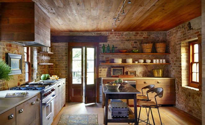 Thi công bếp phong cách Rustic cần ánh sáng ấm và chất liệu gần gũi. Nên kết hợp đèn treo và tấm gỗ màu trầm. Sử dụng phụ kiện đồng hoặc sắt để tăng cá tính.